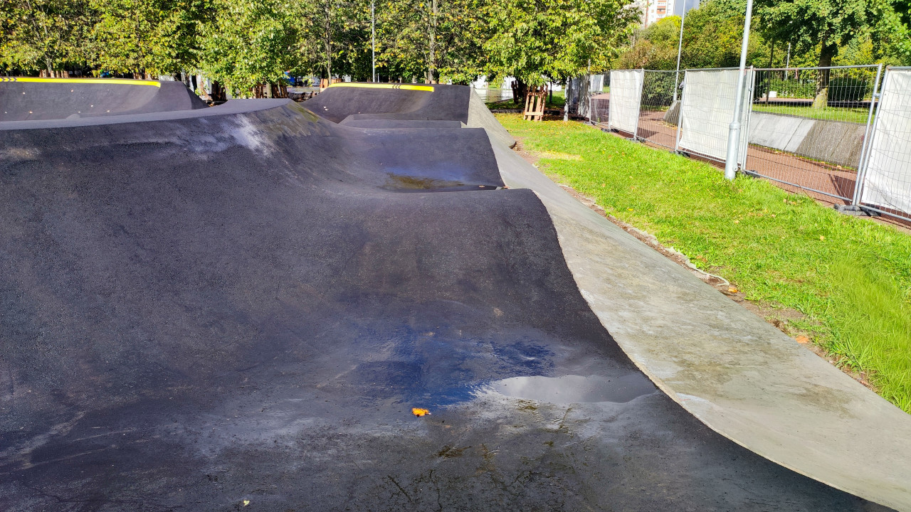 На фото запечатлён участок скейт-парка с плавными изгибами асфальтового покрытия и дренажными уклонами. Поверхность влажная после дождя, в некоторых местах видны небольшие лужи. По краям установлены строительные ограждения, рядом — зелёный газон и деревья. Такие площадки предназначены для катания на скейтбордах, BMX и самокатах. Изображение подходит для публикаций о благоустройстве, строительстве спортивных объектов и организации городских парков.