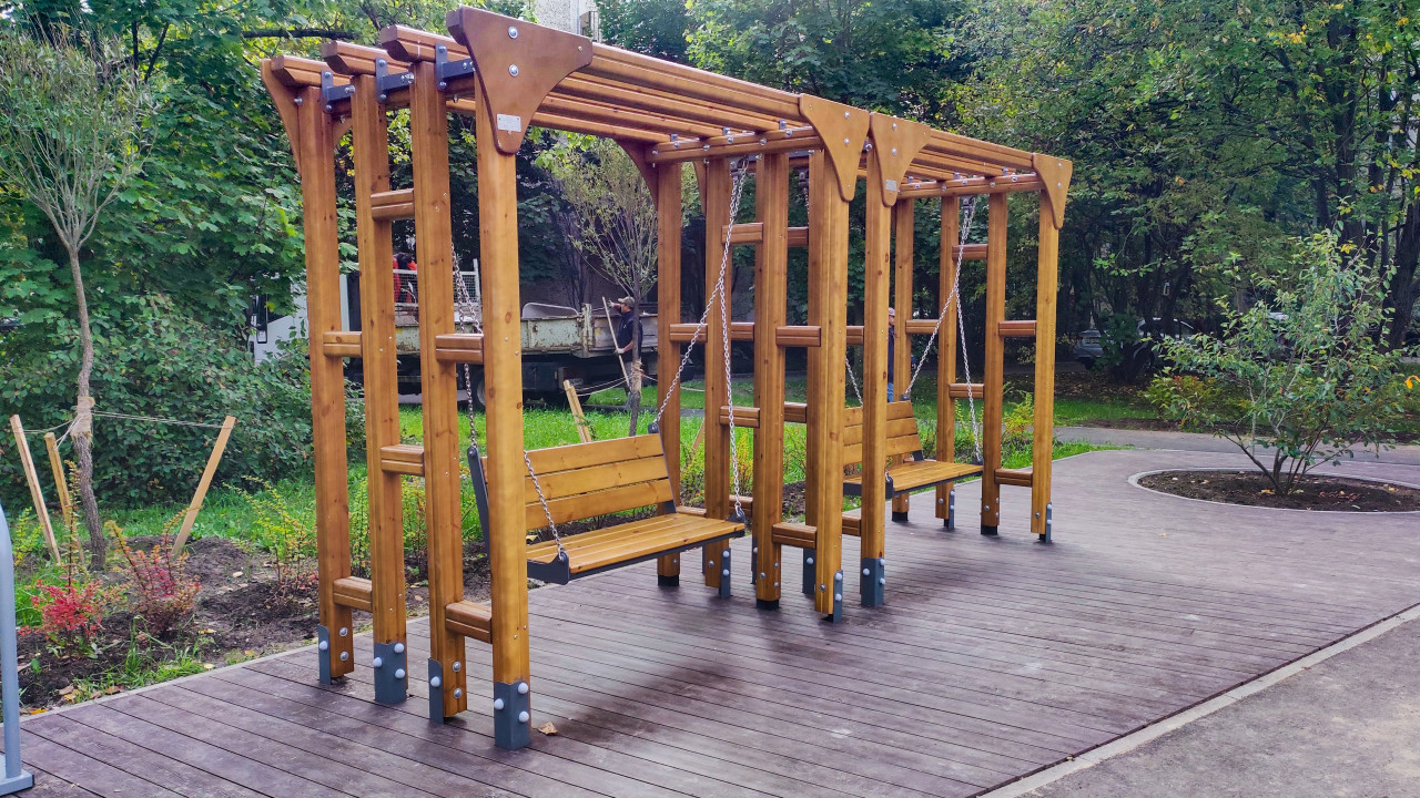 На фото изображены уличные качели с деревянной рамой и подвесными скамейками, установленные на настиле из досок. Конструкция совмещает функции перголы и зоны отдыха, предназначена для благоустроенного городского парка. Качели выполнены из обработанного дерева с металлическими креплениями и цепями. На заднем плане видны кустарники и деревья, указывающие на парковую территорию. Снимок может использоваться в материалах о современном благоустройстве, проектировании общественных пространств, ландшафтном дизайне и городских малых архитектурных формах.