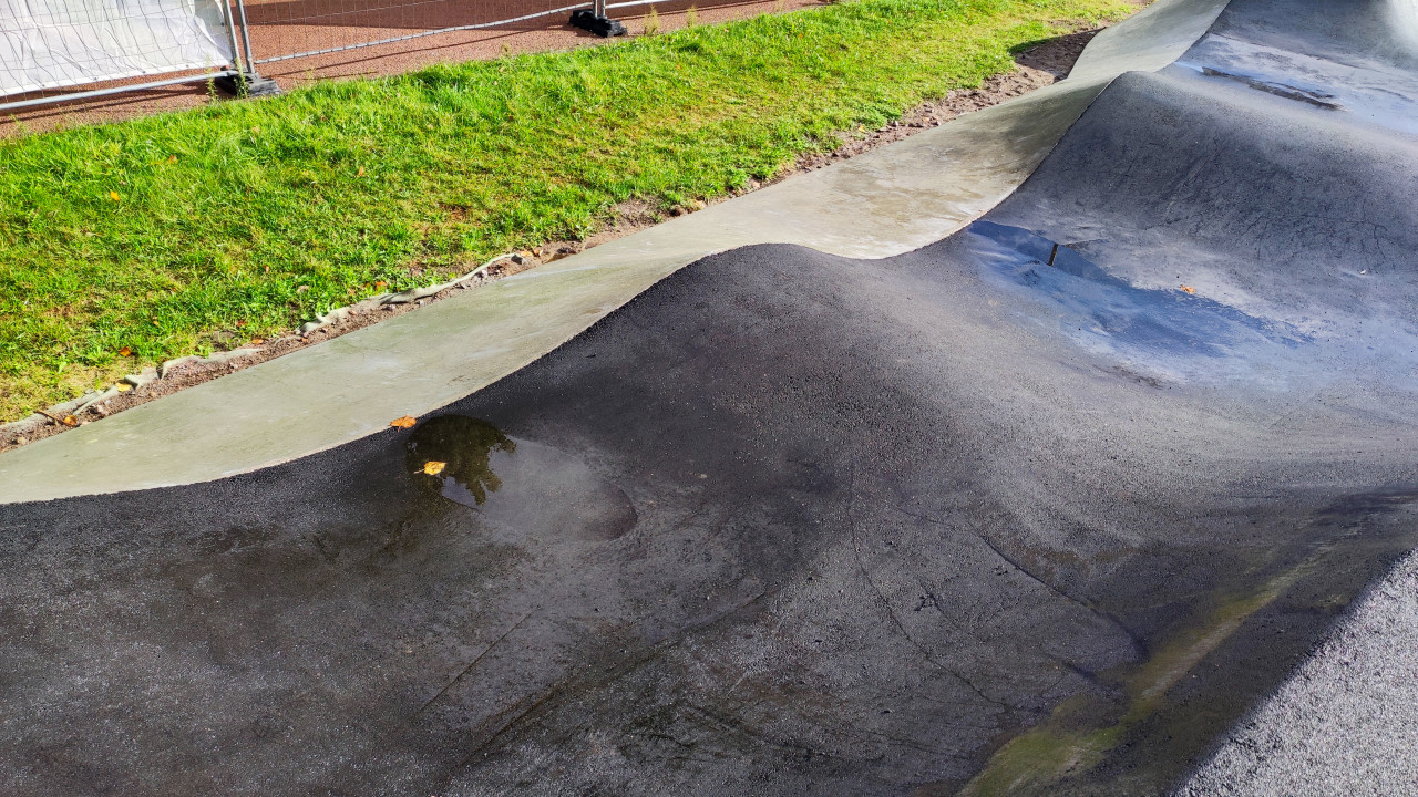 На изображении крупным планом виден фрагмент асфальтового скейт-парка с плавными изгибами и уклонами. На поверхности — следы влаги и отражения неба после осадков. По краю конструкции уложен бордюр из бетона, рядом — зелёная трава и временные строительные ограждения. Подобные сооружения создаются в рамках благоустройства общественных зон и предназначены для катания на роликах, самокатах и велосипедах. Фото подходит для публикаций о городских спортивных проектах и инженерных решениях.
