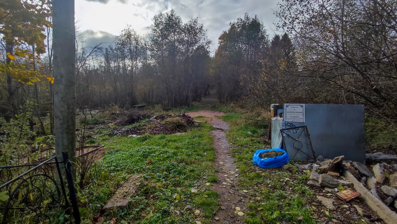 Входная тропа к кладбищу с мусорной площадкой и табличкой