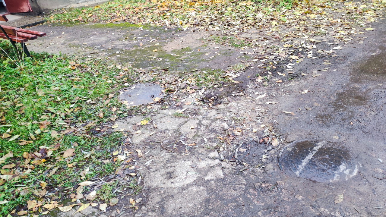 придомовая территория двор дворовая территория двор жилого дома жилой двор жилой квартал спальный район городской двор городская среда благоустройство территория около дома канализационный люк дворовая дорога сезон осень опавшие листья мокрая поверхность зелёная зона инженерные сети эксплуатация инфраструктуры внутридворовой участок дорожное покрытие износ локальный дефект придомовая инфраструктура городской район затопление после осадков междомовая зона техсостояние дорожного полотнаПохожие фотографии