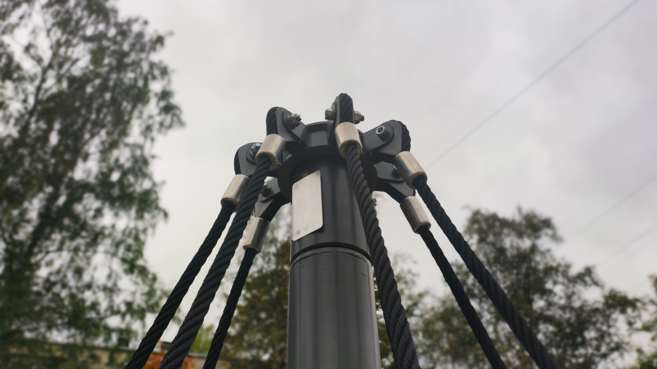 На фото крупным планом показана верхняя часть металлической стойки игрового комплекса с радиально закреплёнными канатами. Видны прочные стальные зажимы и болтовые соединения, обеспечивающие устойчивость конструкции. Фон занимает небо и верхушки деревьев, что указывает на съёмку на открытой детской площадке. Кадр иллюстрирует техническое исполнение и качество монтажа оборудования, выполненного в соответствии с требованиями безопасности.