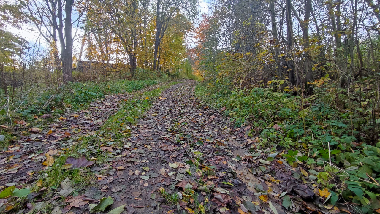 На фото изображена грунтовая дорога, проходящая сквозь осенний лес. Поверхность дороги усыпана опавшими листьями, по обе стороны растут деревья с частично сохранившейся жёлто-зелёной листвой. В кадре чувствуется лёгкий подъём рельефа, а вдалеке дорога уходит к просвету между деревьями. Освещение мягкое, дневное, характерное для конца осени. Снимок можно использовать в статьях о природе, экологии, туризме, сезонных изменениях или для оформления пейзажных тем в фотоархивах.