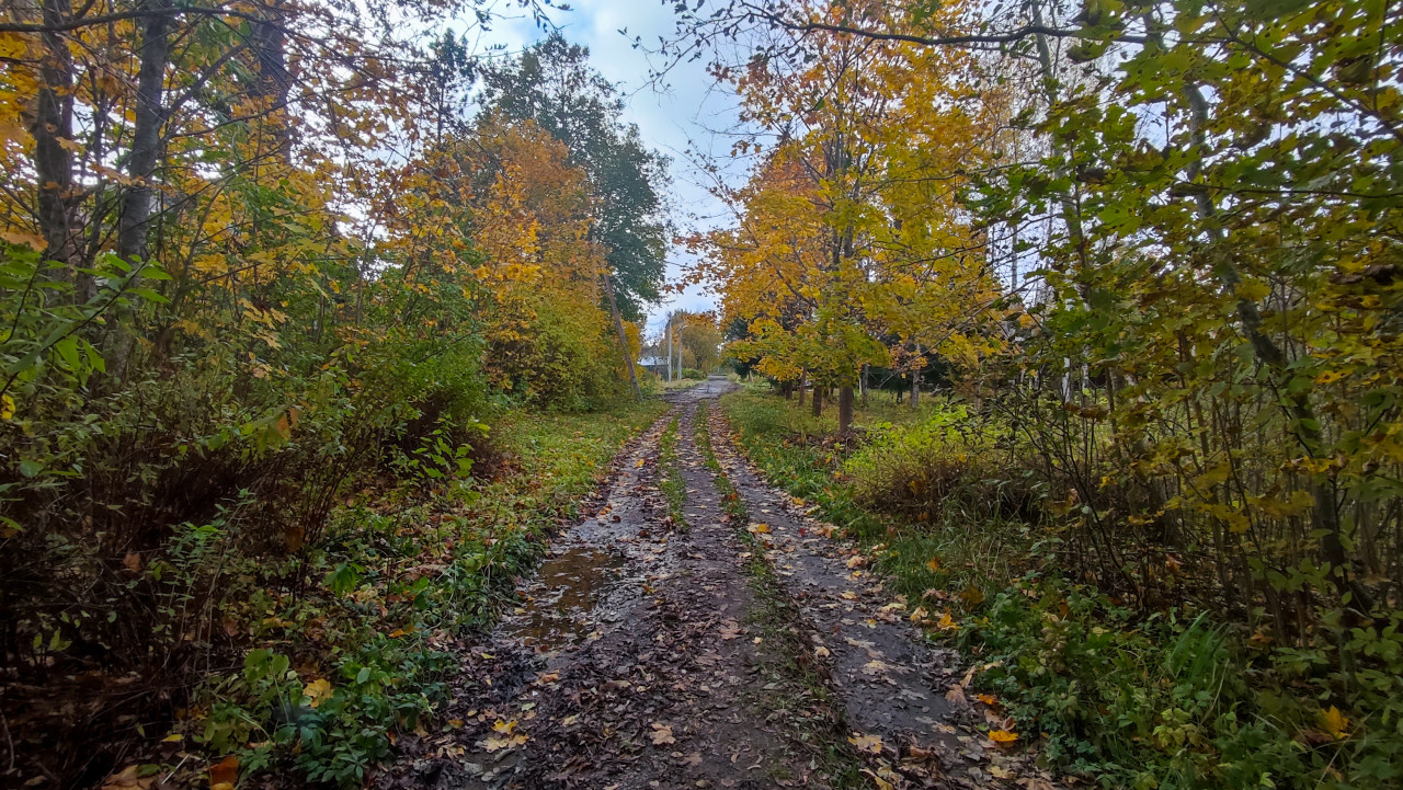 Фотография показывает узкую просёлочную дорогу, покрытую влажной землёй и опавшей листвой. По обеим сторонам дороги растут деревья с пожелтевшей и оранжевой листвой, характерной для середины осени. Вдали виден изгиб дороги и редкие строения на горизонте, что создаёт впечатление сельской местности. Местность типична для северо-западной России, где в октябре устанавливается влажная и прохладная погода. Снимок можно использовать в материалах о природе, сезонах года, путешествиях, загородной жизни и экологии.