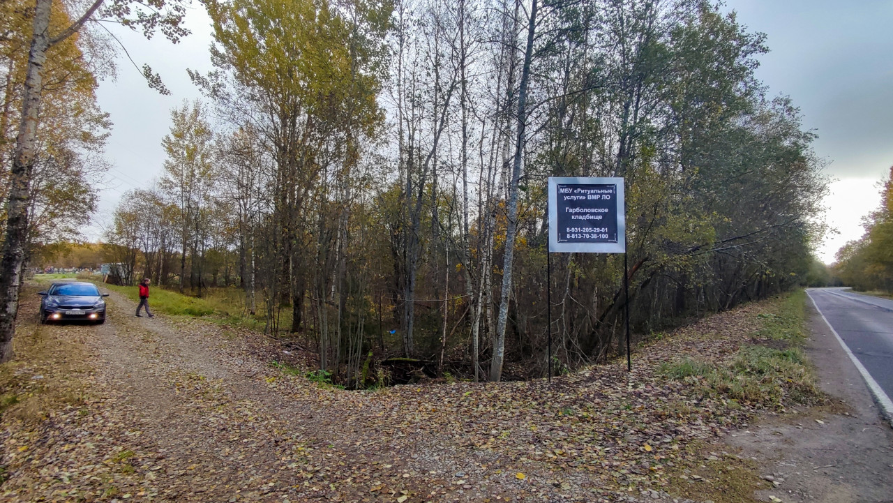 На снимке изображён въезд к Гарболовскому кладбищу, расположенному у загородной трассы. Слева на переднем плане виден автомобиль и человек, переходящий дорогу. Вдоль лесополосы установлен информационный щит с надписью «МБУ "Ритуальные услуги" ВМР ЛО. Гарболовское кладбище». За указателем начинается гравийная дорога, ведущая внутрь леса. Осенняя листва и пасмурное небо создают естественное освещение. Фото можно использовать в публикациях о муниципальной инфраструктуре, дорожных указателях и ритуальных объектах.