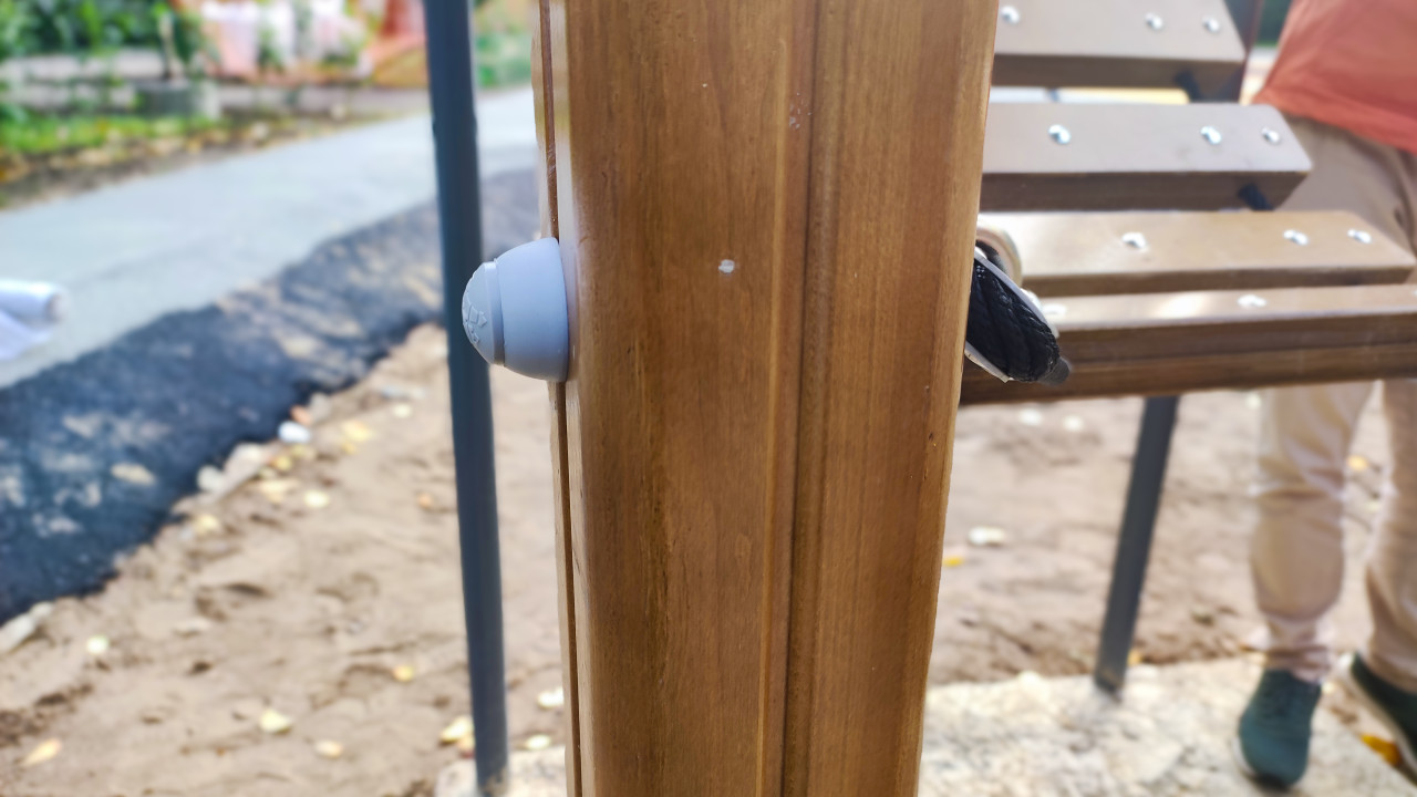На фото крупным планом показана деталь конструкции детской площадки — место крепления троса к деревянной опоре. Видна пластиковая защитная заглушка, закрывающая болтовое соединение, а также участок металлического троса, уходящего вглубь конструкции. На заднем плане — песчаное основание и человек, участвующий в осмотре оборудования. Снимок используется для визуальной фиксации технического состояния элементов детских сооружений и оценки качества сборки.