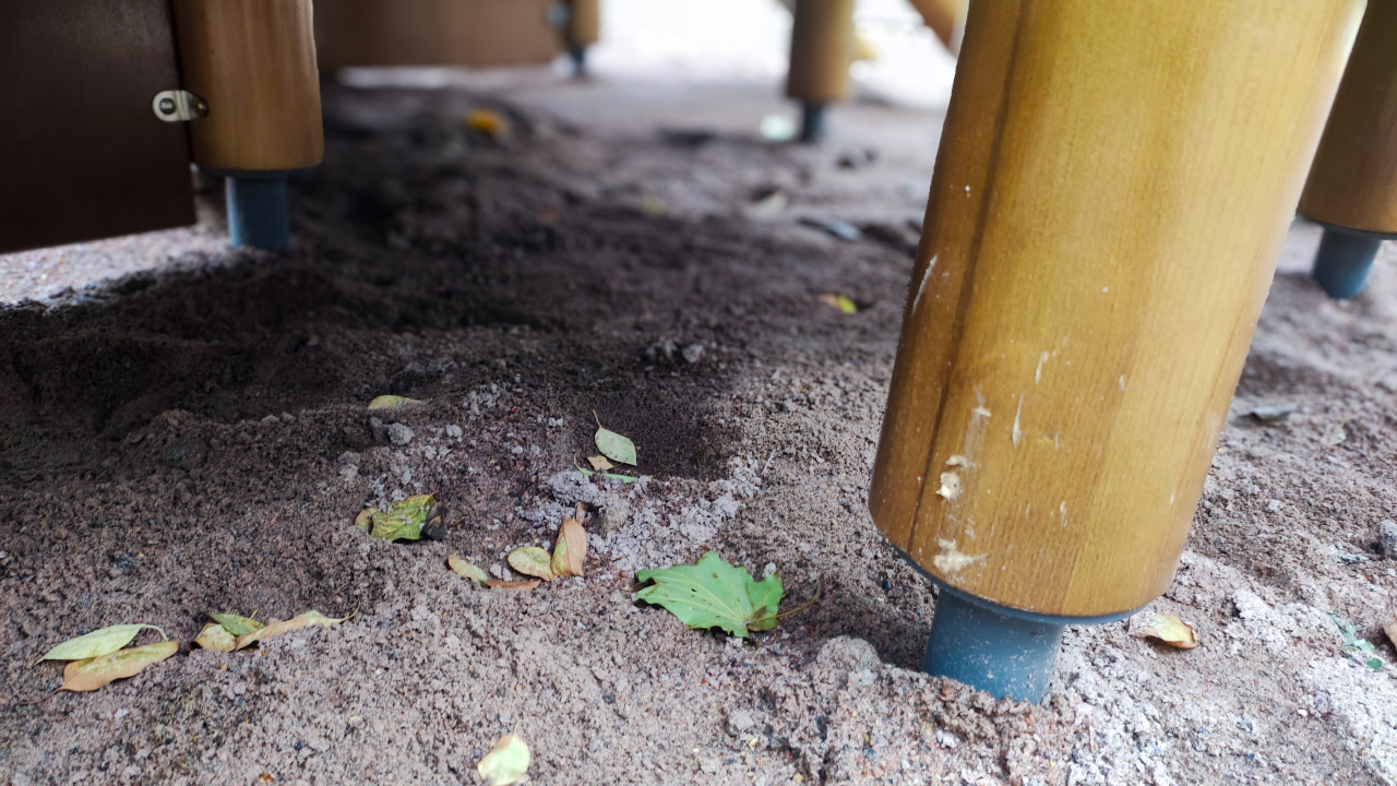 На фотографии показана нижняя часть игрового домика, где видны деревянные опоры, установленные на металлические стаканы в грунтовом основании. На поверхности присутствуют следы песка, листва и мелкий мусор. Снимок используется для фиксации состояния основания при инженерном осмотре и оформлении отчётной документации по строительной экспертизе.