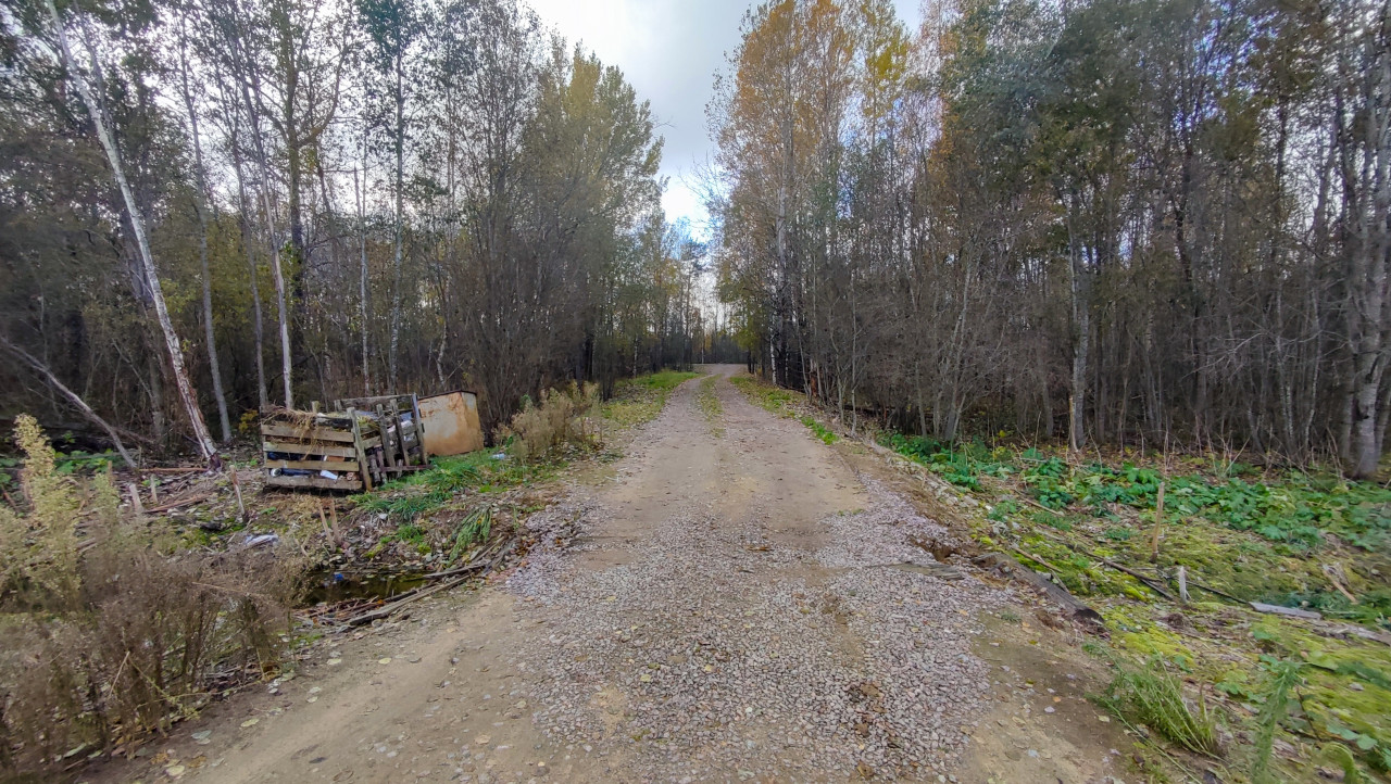 Фотография показывает просёлочную дорогу, идущую через лиственный лес. Дорожное покрытие состоит из песка и щебня, по краям видны остатки досок, поддонов и металлический контейнер, использующийся для сбора мусора. Осенняя листва и низкое освещение подчёркивают сезон. Местность типична для окраин деревень и подъездных путей к кладбищам или хозяйственным участкам. Фото подходит для иллюстрации тем об экологии, благоустройстве, утилизации отходов и сельской инфраструктуре.