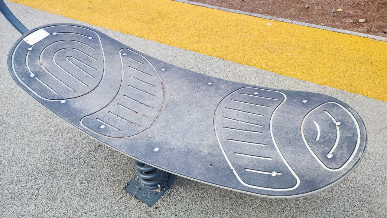 На фото изображён элемент детского игрового оборудования — балансировочная платформа, установленная на пружине. Поверхность площадки выполнена из прорезиненного материала, а само устройство состоит из металлического основания и панели со специальным противоскользящим покрытием с рисунком для ног. Такое оборудование используется для развития координации и равновесия у детей. Фон включает яркую жёлтую полосу покрытия, типичную для разделения зон. Фотография может применяться в статьях о спортивной инфраструктуре, инклюзивных игровых площадках, стандартах безопасности и проектировании малых архитектурных форм.