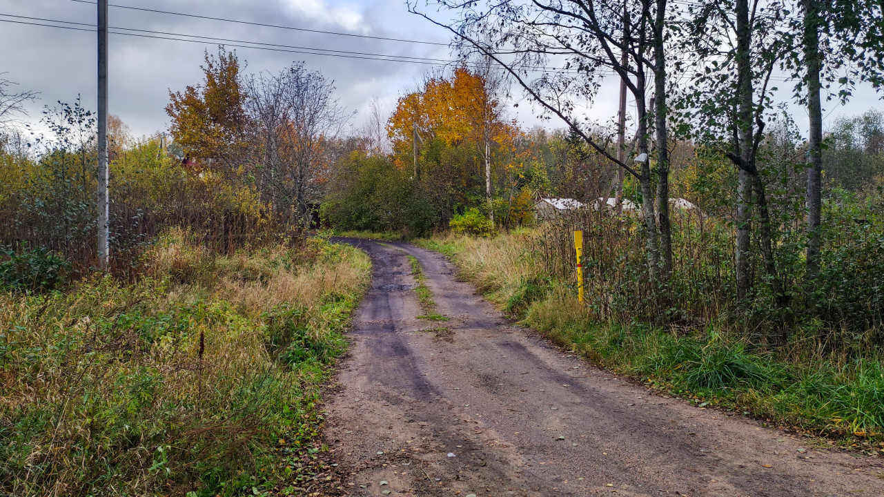 На фотографии изображена узкая грунтовая дорога, ведущая между деревьями с пожелтевшей и оранжевой листвой. Поверхность дороги неровная, утрамбованная, с участками влажной почвы и следами от колёс. По краям видна густая растительность и травы, справа проходит линия электропередачи. Вдали заметны крыши хозяйственных построек, частично скрытые деревьями. Снимок отражает типичный осенний пейзаж пригородной местности северо-запада России и может использоваться в материалах о природе, сезонных изменениях, сельской инфраструктуре и дорожных условиях.