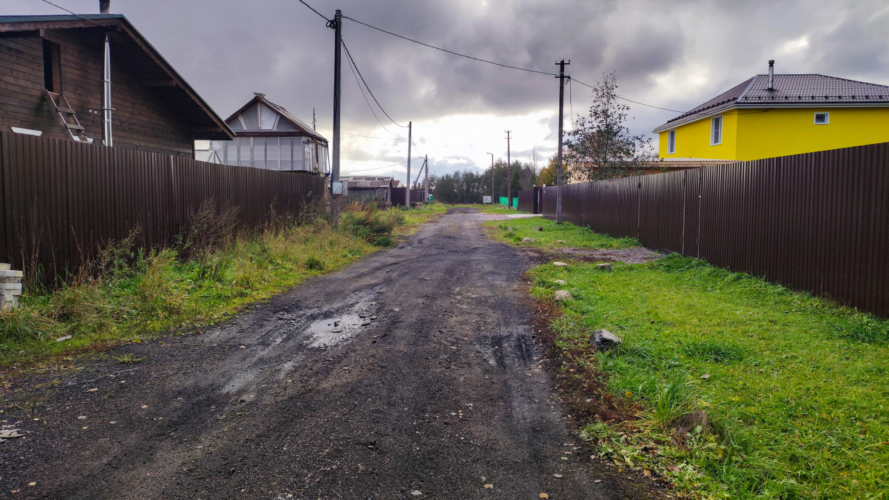 Фотография показывает участок частного сектора с грунтовой дорогой, пролегающей между домами. Справа виден жёлтый двухэтажный дом с забором из профнастила, слева — деревянные и кирпичные постройки с оградами. По дороге видны следы транспорта и небольшие неровности. На фоне — пасмурное небо и низкое осеннее освещение. Такое изображение можно использовать для публикаций о загородной инфраструктуре, строительстве частных домов, жизни в посёлках и сезонных пейзажах.