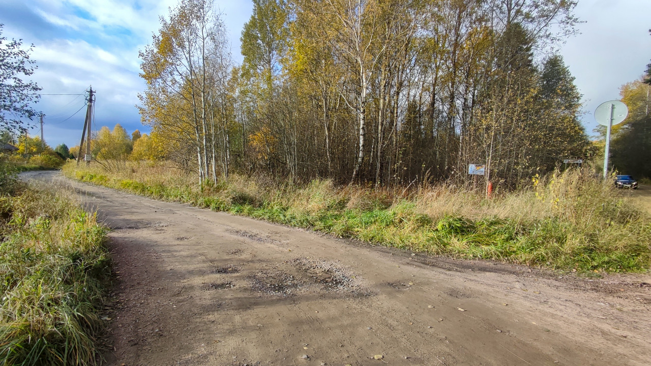На фотографии изображена грунтовая дорога на пересечении двух сельских улиц, уходящих в стороны среди деревьев и кустарников. Дорога частично покрыта щебнем, видны ямы и следы от проезда автомобилей. По обочинам растёт высокая трава, за которой начинается смешанный лес с берёзами и елями, окрашенными в жёлтые осенние тона. Слева стоят деревянные опоры линий электропередачи, а справа виден дорожный знак и автомобиль, припаркованный у леса. Снимок сделан в дневное время в сельской местности, вероятно, в Ленинградской области. Изображение можно использовать для статей о загородных дорогах, инфраструктуре деревень, проблемах содержания дорожного покрытия или теме сезонных изменений в природе.