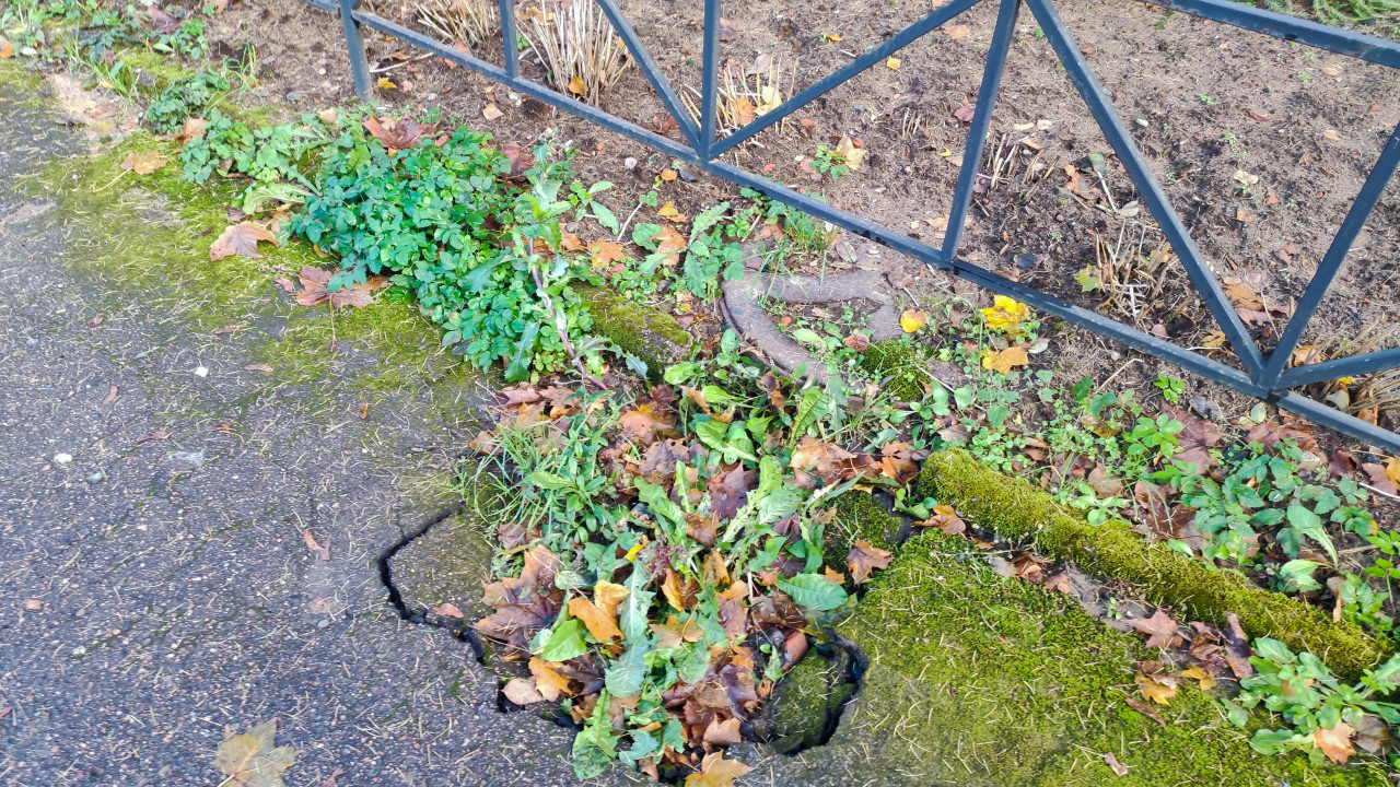 Корневая деформация тротуарного покрытия вдоль ограждения