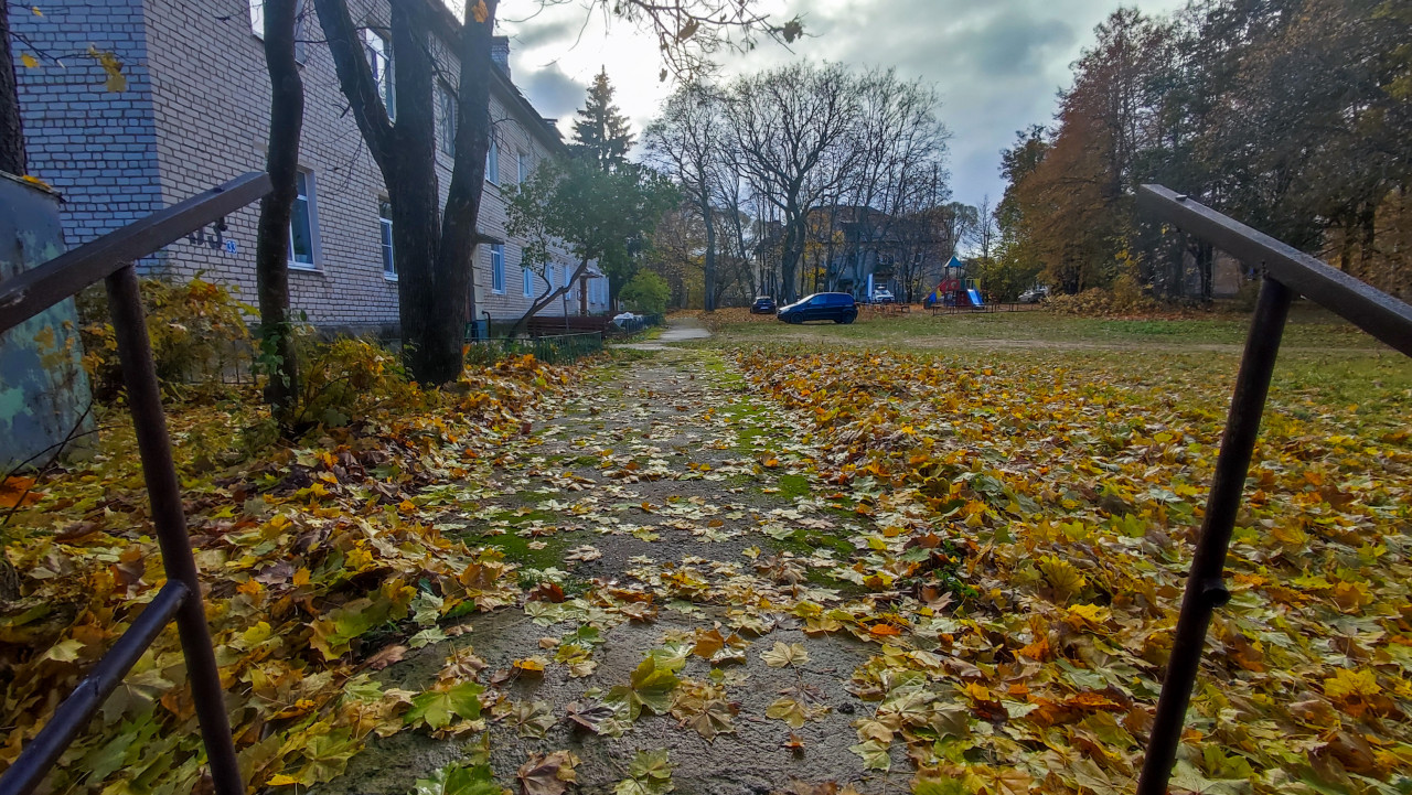 Фотография показывает пешеходную дорожку в жилом дворе в осенний период. Поверхность покрытия частично закрыта опавшей листвой, в промежутках заметно разрастание мха, что свидетельствует о длительном удержании влаги и недостатке дренажа. По бокам дорожки расположены деревья и газон, также покрытые листьями. Покрытие имеет неровности и следы просадки, что указывает на нарушение основания или износ старого асфальта. В перспективе видна придомовая территория с жилым зданием и детской площадкой. Снимок может использоваться в тематике оценки состояния дворовых территорий, подготовки планов ремонта покрытия, диагностики эксплуатационных дефектов и визуализации сезонных изменений городской среды.