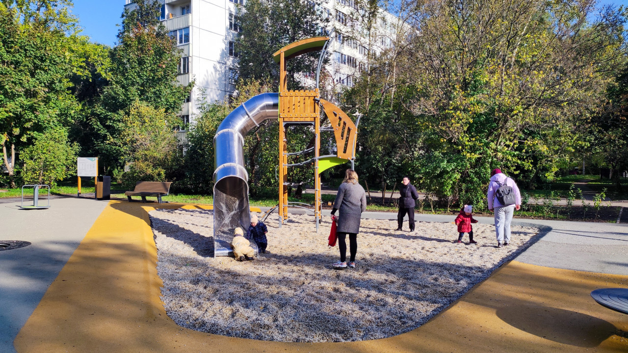 На снимке запечатлена дворовая игровая площадка, на которой находятся дети и взрослые. В центре кадра — металлическая горка с деревянным каркасом и зелёными элементами. Поверхность покрыта гравием, рядом расположены лавочки и урна. На заднем плане — деревья с листвой осеннего оттенка и фасад жилого дома. Атмосфера указывает на тёплую погоду и утреннее солнце. Фотография демонстрирует пример современной организации общественного пространства и может использоваться в материалах о благоустройстве, урбанистике и социальной инфраструктуре.