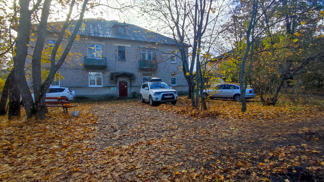 На фотографии изображена придомовая территория жилого дома, выполненного из кирпича, с небольшим дворовым пространством перед входом. На переднем плане заметен слой опавшей листвы, характерный для осеннего периода, а также грунтовая поверхность, используемая как временная парковочная зона. У здания видны балконы и входная группа, рядом припаркованы несколько автомобилей. По периметру территории растут деревья и кустарники, формирующие зелёную зону. Снимок может использоваться для иллюстрации состояния придомовой инфраструктуры, материалов по техническому содержанию общедомовых территорий, вопросов благоустройства и эксплуатации жилых объектов.