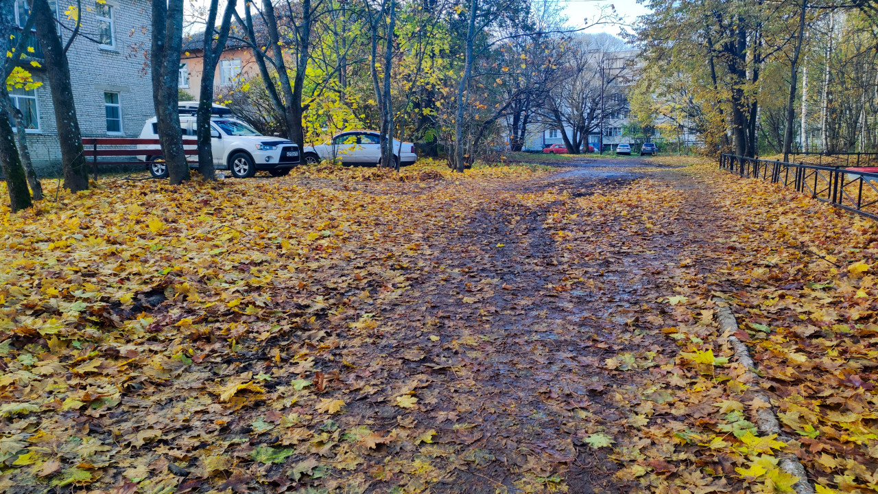 придомовая территория двор дворовая территория двор жилого дома жилой двор жилой квартал спальный район городской двор городская среда благоустройство территория около дома грунтовая дорожка листва внутридворовой проезд сезонное покрытие отсутствие асфальта следы автомобиля размыв грунта осень содержание территории пешеходный маршрут эксплуатационный износ влажность придомовая зона обследование территории дефекты благоустройства неукрепленное покрытие сезонные факторы проезд транспорта мягкое основание пешеходная безопасность обслуживание двора нарушение основания эксплуатация покрытияПохожие фотографии