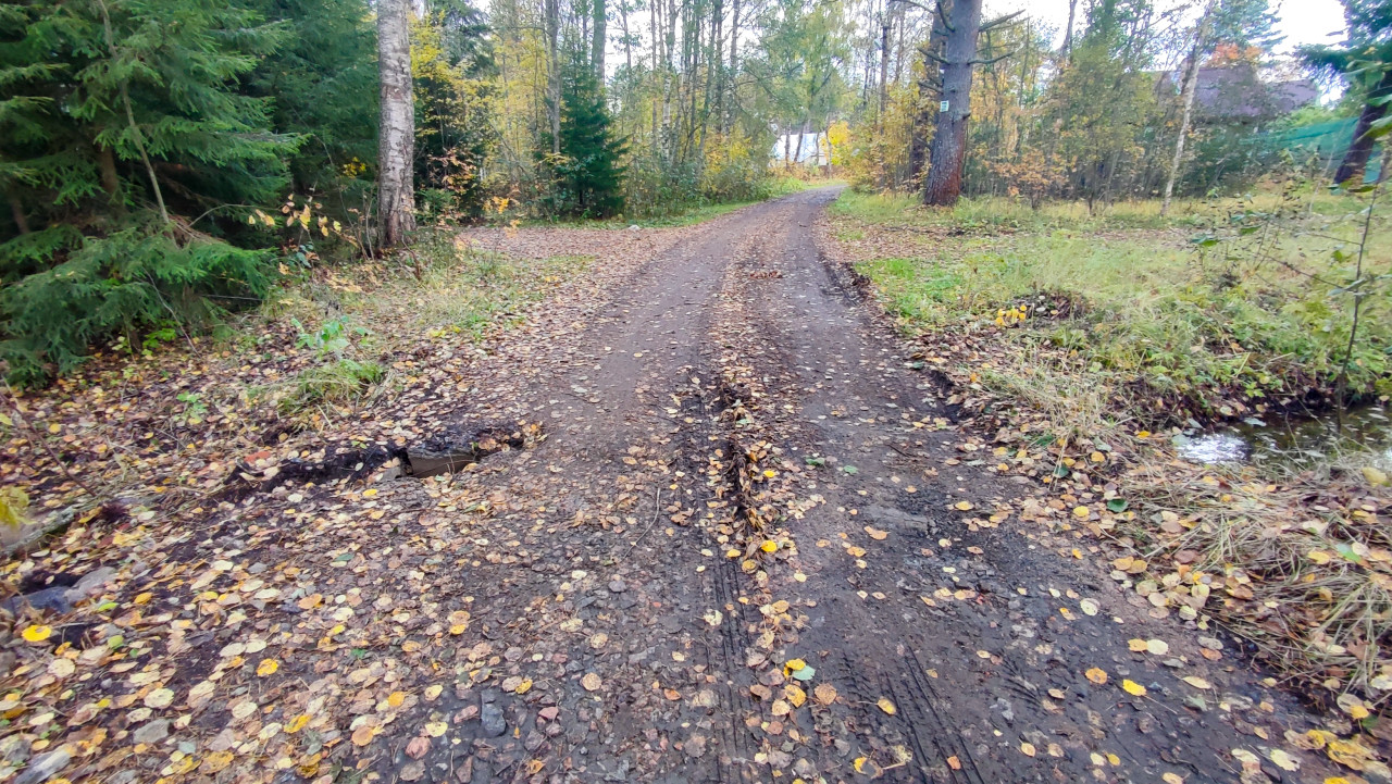 На снимке показана просёлочная дорога с неровным покрытием и заметными колеями, ведущая через смешанный лес. Поверхность дороги покрыта опавшими листьями, а слева виден небольшой дренажный канал с водой. По обе стороны растут берёзы, ели и подлесок с осенней растительностью. Сцена передаёт типичный облик лесных дорог Ленинградской области в октябре. Изображение подходит для тем о дорожной инфраструктуре, природной экологии и сезонных изменениях.