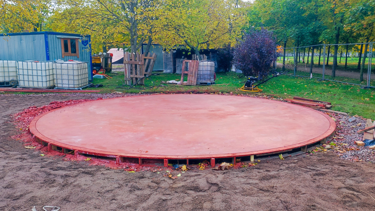 Круглая бетонная площадка на этапе строительства в парковой зоне