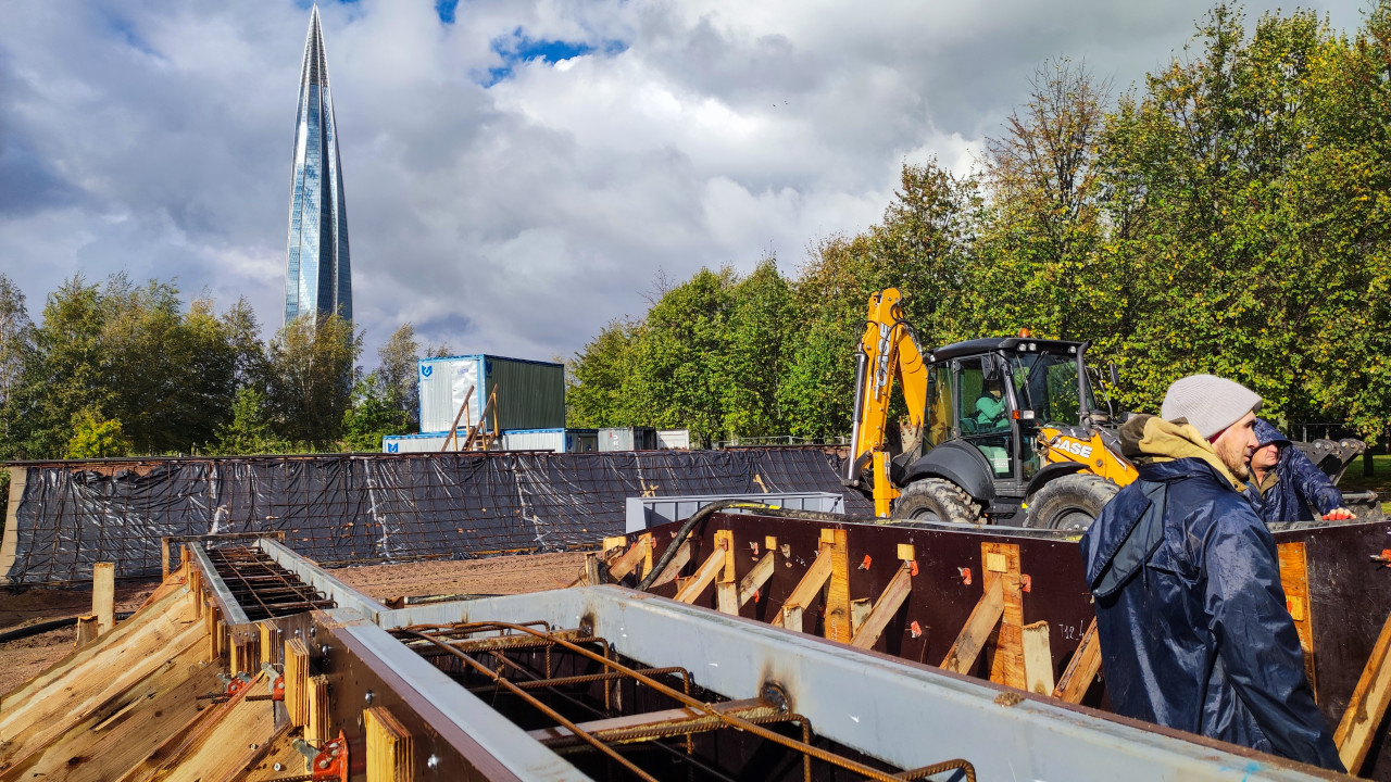 Монтаж опалубки и арматуры у основания строительного объекта рядом с Лахта-центром