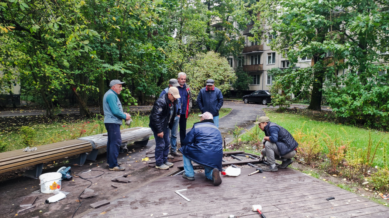 На снимке группа мужчин занимается установкой деревянных элементов покрытия или скамеек на площадке в жилом дворе. Видны инструменты, пластиковое ведро с клеевым составом, рулоны материала и элементы тротуарной плитки. На заднем плане — зелёные насаждения и многоквартирные дома советской постройки. Фотография документирует этап монтажа в рамках программы благоустройства или капитального ремонта придомовой территории.