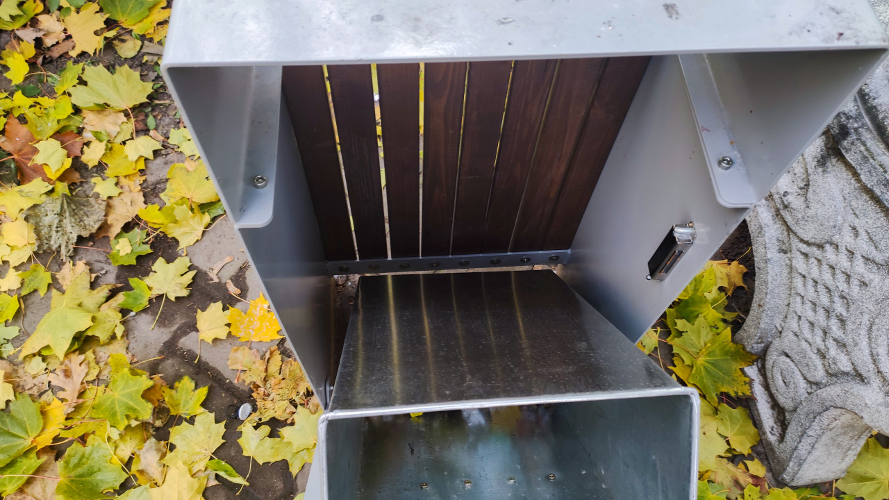 На снимке запечатлена урна с вынутым металлическим контейнером, установленная на тротуарной плите и окруженная слоем опавшей листвы. Видна конструкция корпуса и крепления, что демонстрирует особенности обслуживания. Вокруг урны располагается придомовая территория с элементами озеленения. Фотография может применяться для иллюстрации технического содержания МАФ, работы коммунальных служб и вопросов эксплуатации уличного оборудования.
