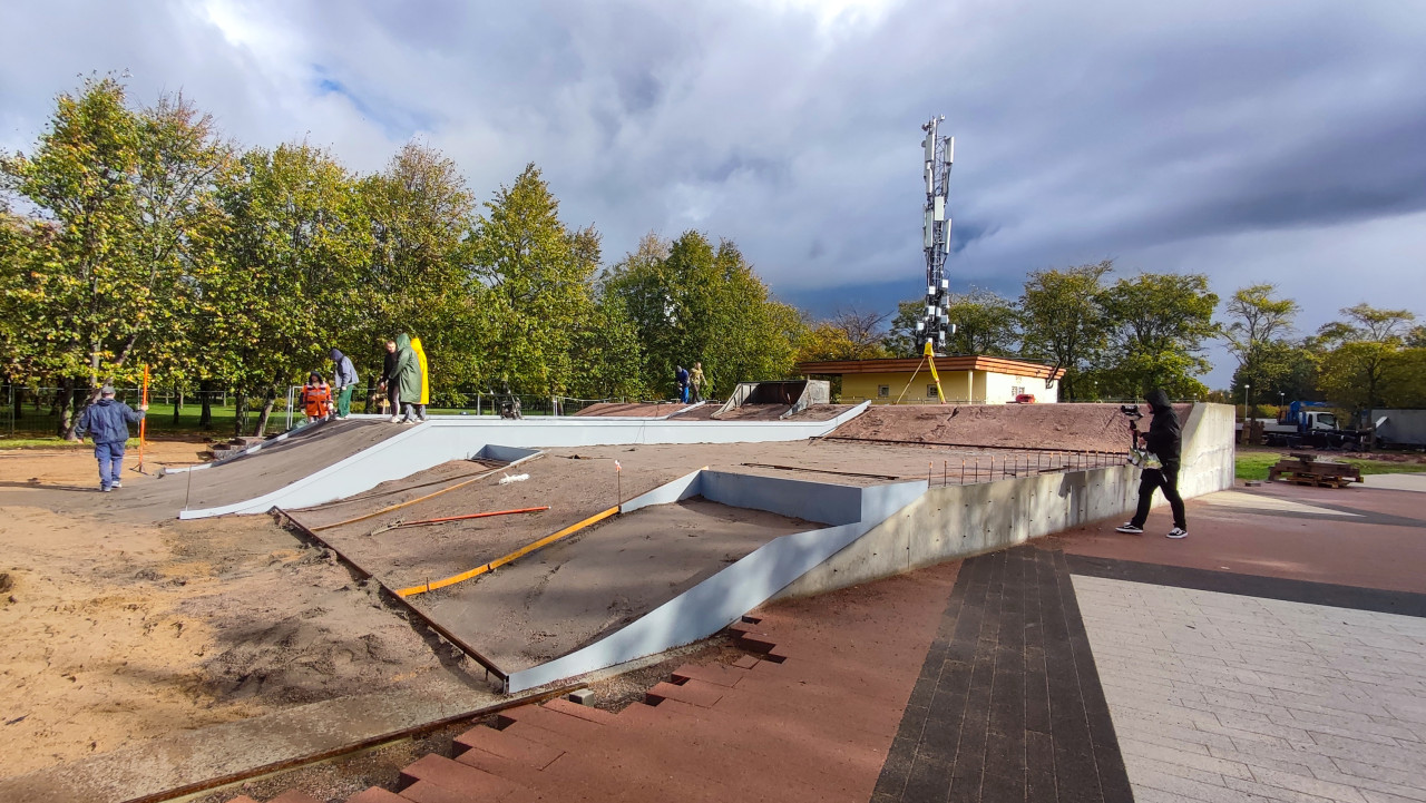 На снимке изображён участок с возведёнными бетонными рампами и рабочими, выполняющими их выравнивание и подготовку к отделке. Поверхность конструкций засыпана песком, видны элементы арматуры и инструменты. На заднем плане — деревья и здание с антенной связи. Сцена отражает процесс благоустройства общественного пространства, предположительно скейт-парка или спортивной площадки. Фото подходит для материалов о градостроительстве, благоустройстве, реконструкции и техническом надзоре.