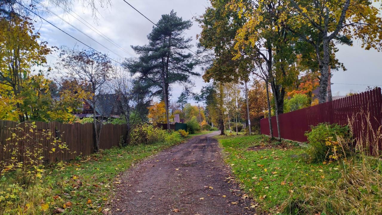 На снимке показана просёлочная дорога, проходящая между частными участками. По обе стороны стоят заборы из дерева и металла, а вдоль них растут деревья с жёлто-зелёной листвой. По дороге видны следы влаги и опавшие листья. Вдали — крыши домов и линии электропередачи. Обстановка типична для загородных посёлков северо-западной России в октябре. Сцена отражает переход от лета к осени и может использоваться в материалах о дачном быте, инфраструктуре СНТ или сезонных изменениях природы.