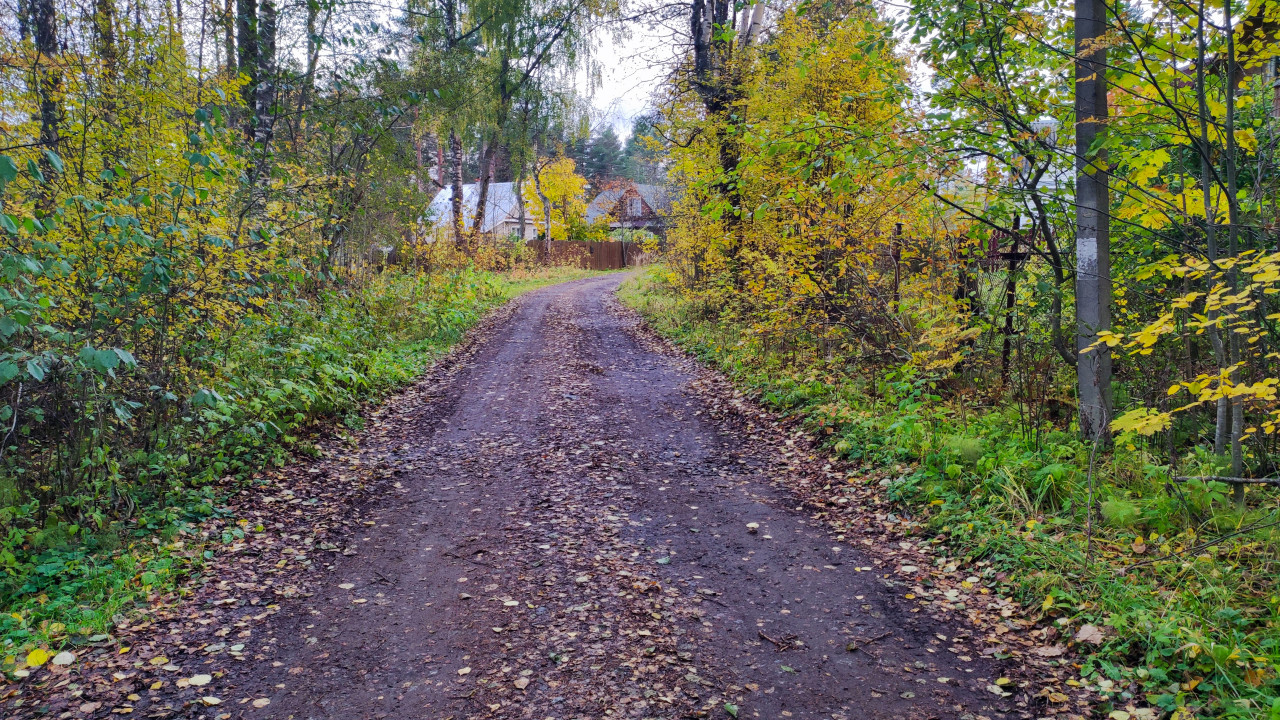 На фотографии изображена узкая грунтовая дорога, уходящая вглубь леса. По обочинам растут берёзы, осины и кустарники, покрытые осенней листвой. Дорога покрыта слоем опавших листьев и слегка влажная после дождя. Вдалеке видны частные дома с деревянными заборами, что указывает на сельскую местность или дачный посёлок. Осенние краски создают ощущение перехода сезона, характерного для северо-западной части России. Такое изображение может использоваться в статьях о сельской инфраструктуре, сезонных изменениях природы или обустройстве загородных дорог.