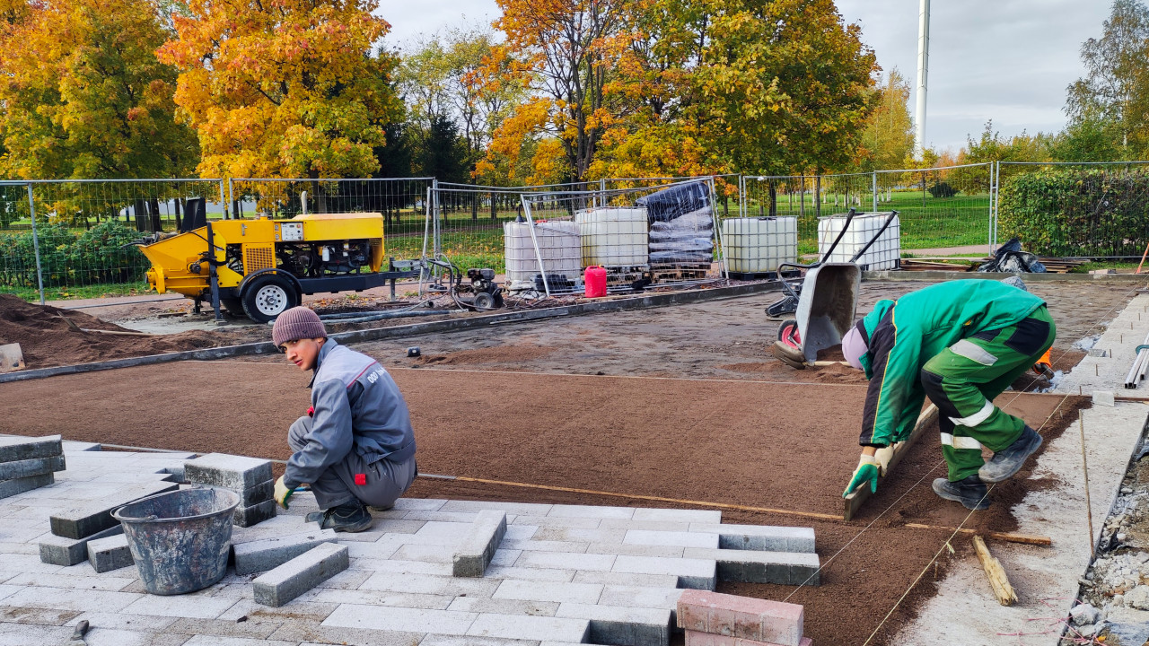благоустройство благоустройство территории стройплощадка строительная площадка строительные работы строительство строительный участок тротуарная плитка укладка плитки рабочие строительство дорог инженерные работы песчаное основание инфраструктура техника осень общественное пространство выравнивание строительные процессы строительные технологии благоустройство города архитектура проектирование монтаж укладка покрытия дорожные работы оборудование парк городская среда наружные работы строительство объектов ручной трудПохожие фотографии