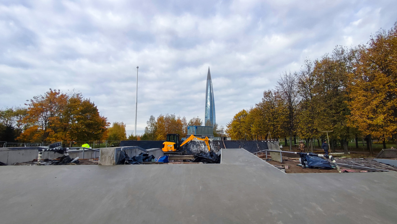 На снимке изображена строительная площадка с техникой JCB и бетонными конструкциями, расположенная в осенней парковой зоне Санкт-Петербурга. Вдали видна башня Лахта Центр, ставшая современной архитектурной доминантой города. Рабочие занимаются монтажом и укладкой элементов будущего общественного пространства. На площадке присутствуют контейнеры, инструменты, строительные материалы и временные ограждения. Изображение может использоваться для тем благоустройства, урбанистики и развития инфраструктуры мегаполиса.