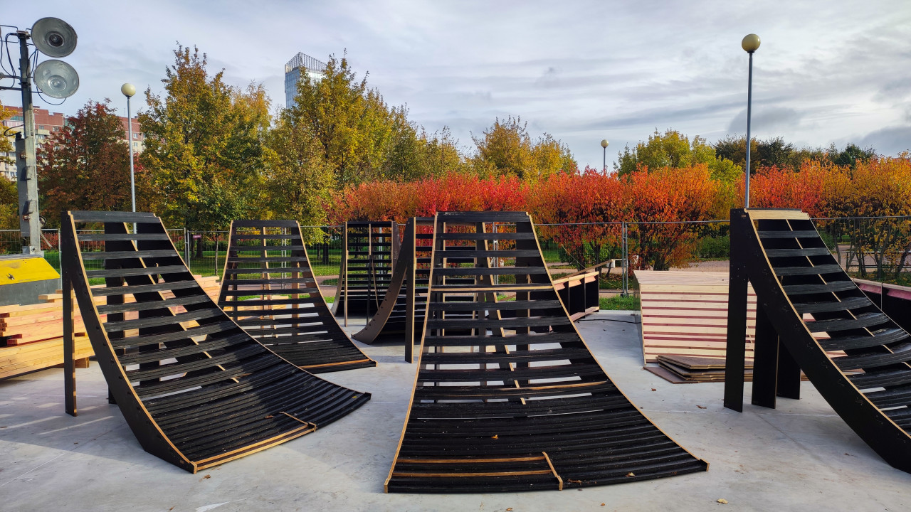 На фотографии изображены отдельные деревянные элементы рамп, установленные на бетонной площадке в парке. Конструкции ещё не покрыты настилом, что позволяет видеть их внутренний каркас. На заднем плане — деревья с красно-золотой осенней листвой и уличное освещение. Снимок отражает этап сборки модульных конструкций и может быть использован в статьях о строительных технологиях, урбанистике и спортивной архитектуре.