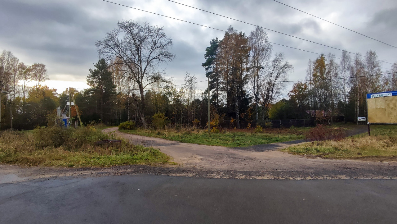 На фотографии показано пересечение асфальтированной трассы и грунтовой дороги, ведущей вглубь загородного посёлка. В центре кадра — дорожная развилка, окружённая травой и кустарниками. Вдали видны деревья без листвы и несколько частных домов. Над дорогами проходят линии электропередачи, а справа установлены щиты для объявлений. Пасмурное небо указывает на осенний сезон. Сцена характерна для небольших населённых пунктов Ленинградской области и подходит для материалов о транспортной сети, благоустройстве и инфраструктуре.