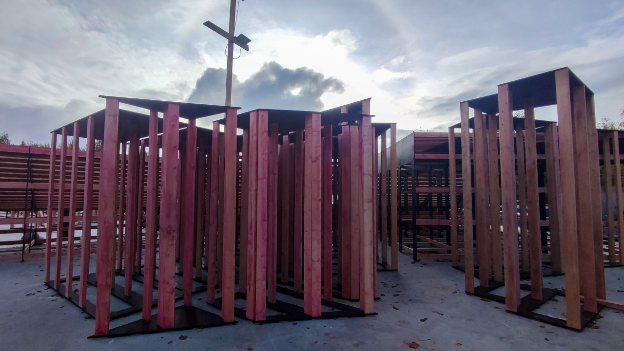 На фото запечатлён этап строительства уличного скейт-парка: на бетонной площадке установлены опорные деревянные рамы из вертикальных брусьев, формирующие основу будущих фигур. Конструкция выполнена из множества повторяющихся деревянных элементов, закреплённых на металлическом основании. Судя по окружению и типу покрытия, монтаж ведётся на открытой общественной территории. Тяжёлая строительная техника не отображена, видны только заготовки и частично собранные секции. Такие конструкции являются основой для рамп и элементов траектории, которые после обшивки образуют катальные поверхности для скейтбордов, BMX и самокатов. Фотография может быть использована в материалах о городском благоустройстве, процессах монтажа спортивных площадок и инфраструктурных проектах.