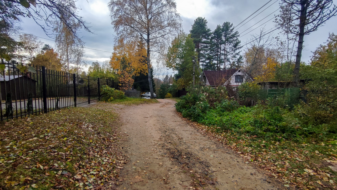 Грунтовая дорога между частными участками в осеннем пейзаже
