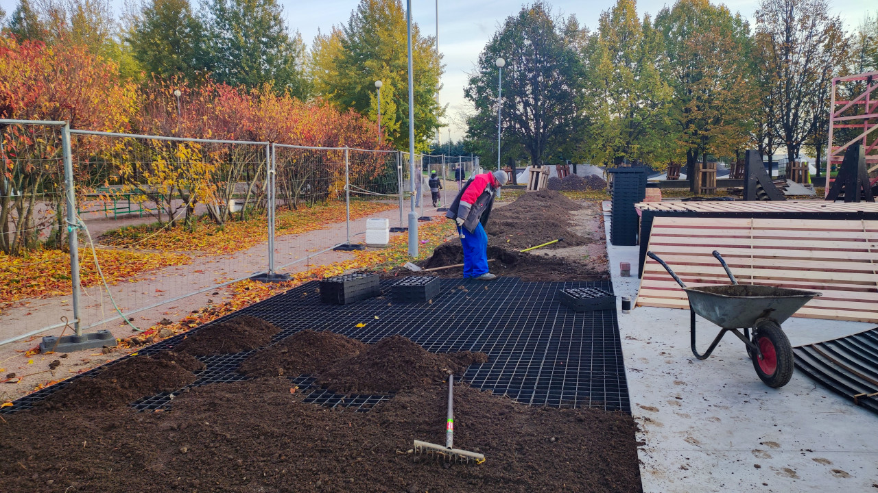 На фотографии показаны ландшафтные работы рядом со скейт-парком, где рабочие укладывают грунт на георешётку для формирования устойчивого основания под будущий газон или зелёную зону. В кадре присутствуют инструменты, строительная тачка и ограждение рабочей зоны. На заднем плане видны каркасные элементы спортивных фигур, что подчёркивает параллельность озеленения и строительных процессов. Снимок отражает этап благоустройства прилегающей территории и подготовки покрытия к последующему озеленению.