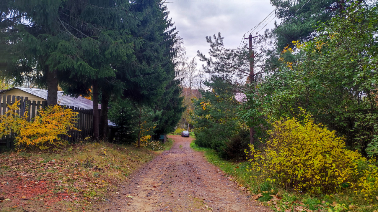 На фотографии изображена узкая грунтовая дорога, уходящая вдоль участков, окружённых хвойными и лиственными деревьями. На обочине стоит автомобиль, частично закрытый растительностью. На деревьях видны жёлтые и зелёные листья, характерные для осени. Линии электропередачи проходят вдоль дороги. Местность типична для дачных посёлков Ленинградской области. Изображение можно использовать в статьях о сезонных пейзажах, сельской инфраструктуре и загородной жизни.