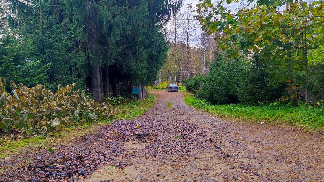 На фотографии изображена узкая дорога с песчано-гравийным покрытием, проходящая между густыми елями и лиственными деревьями. На обочине видны увядшие растения, а в конце дороги припаркован автомобиль. Осенняя растительность окрашена в зелёные и жёлтые тона. Пейзаж типичен для северо-западной части России, где дачные посёлки расположены вблизи лесных массивов. Снимок может использоваться в публикациях о загородной жизни, сельской инфраструктуре, сезонных изменениях и экологии.