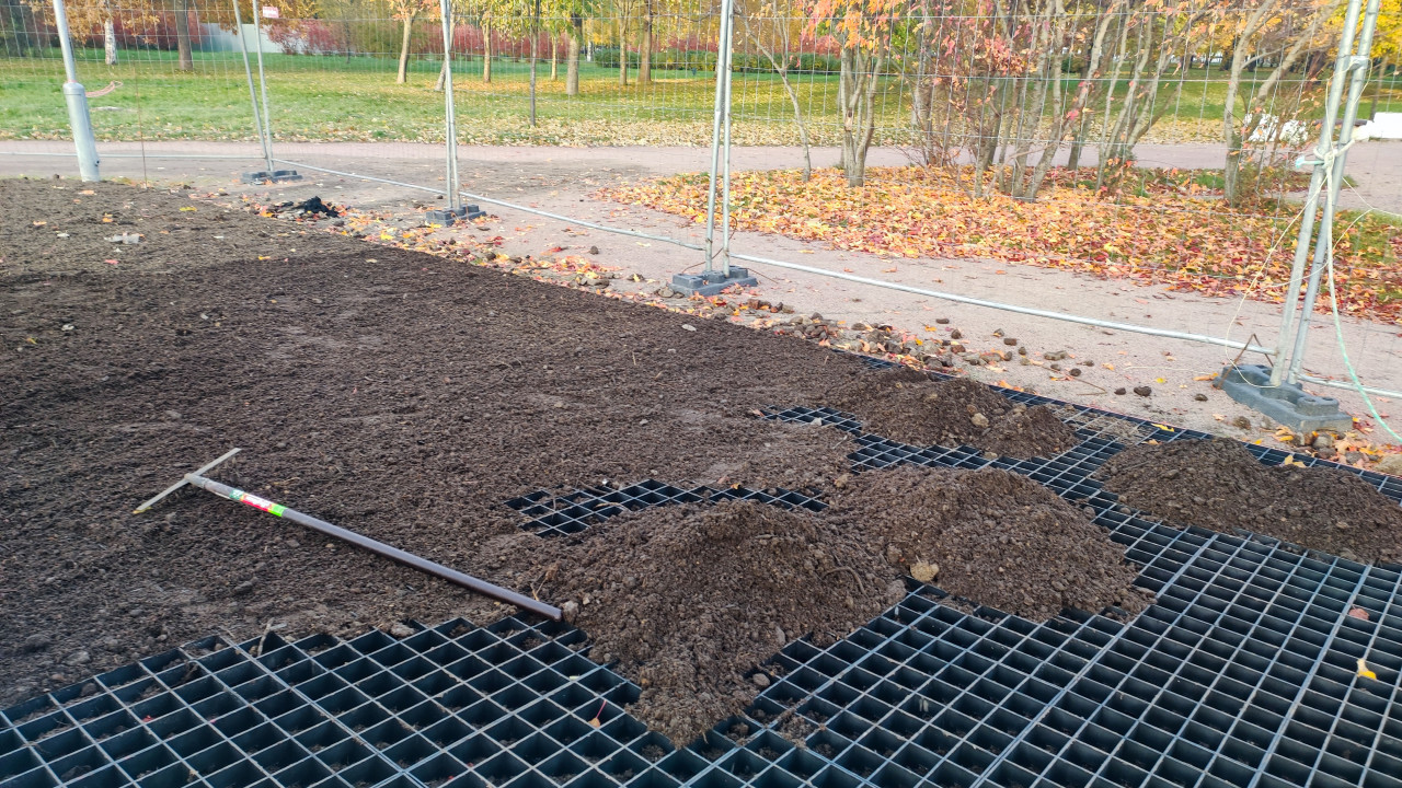 Фотография демонстрирует крупным планом процесс засыпки грунта в георешётку на этапе благоустройства зоны рядом со скейт-парком. На переднем плане лежит инструмент для распределения почвогрунта, а рядом частично сформированные участки основания, куда будет уложен газон или декоративное покрытие. На заднем плане различимо ограждение пешеходной зоны и деревья парка. Кадр можно использовать для освещения технологий ландшафтного строительства и подготовки поверхностей под озеленение.
