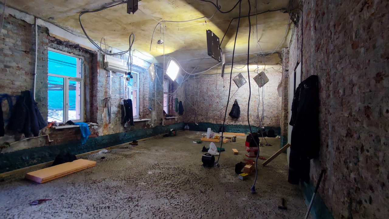 На фотографии показано помещение в старом кирпичном здании, находящееся на стадии черновых ремонтных работ. Потолок покрыт штукатуркой, на стенах видна кирпичная кладка без отделки. К потолку подвешены временные осветительные панели и электропроводка, а на полу лежат строительные материалы и личные вещи рабочих. Через окна с пластиковыми рамами проникает рассеянный свет, закрытый защитной плёнкой. Сцена отражает процесс капитальной реконструкции или реставрации старого здания, при котором сохраняется историческая основа конструкции. Изображение может использоваться в публикациях о строительстве, реставрации архитектурного наследия и капитальном ремонте помещений.