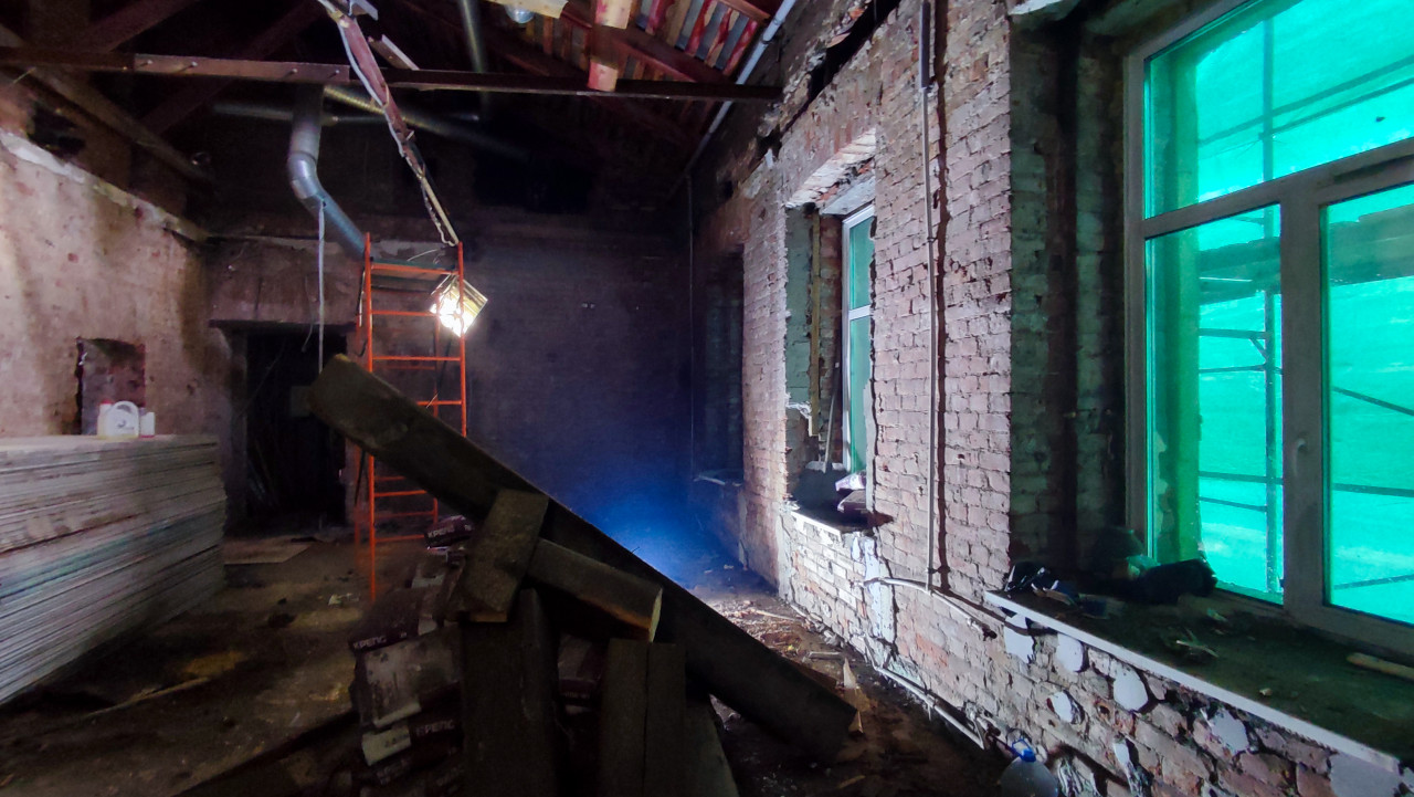 На фотографии показано помещение старого кирпичного здания, где ведутся ремонтные работы. В центре видна строительная лестница и временное освещение, по потолку проходят металлические фермы и воздуховоды. На полу размещены доски, упаковки строительных материалов и инструменты. Окна закрыты зелёной защитной плёнкой, создающей мягкое рассеянное освещение. Помещение находится на этапе реставрации, связанной с укреплением несущих конструкций и подготовкой к отделке. Фото можно использовать в материалах о реконструкции, ремонте и восстановлении исторических зданий и инженерных систем.