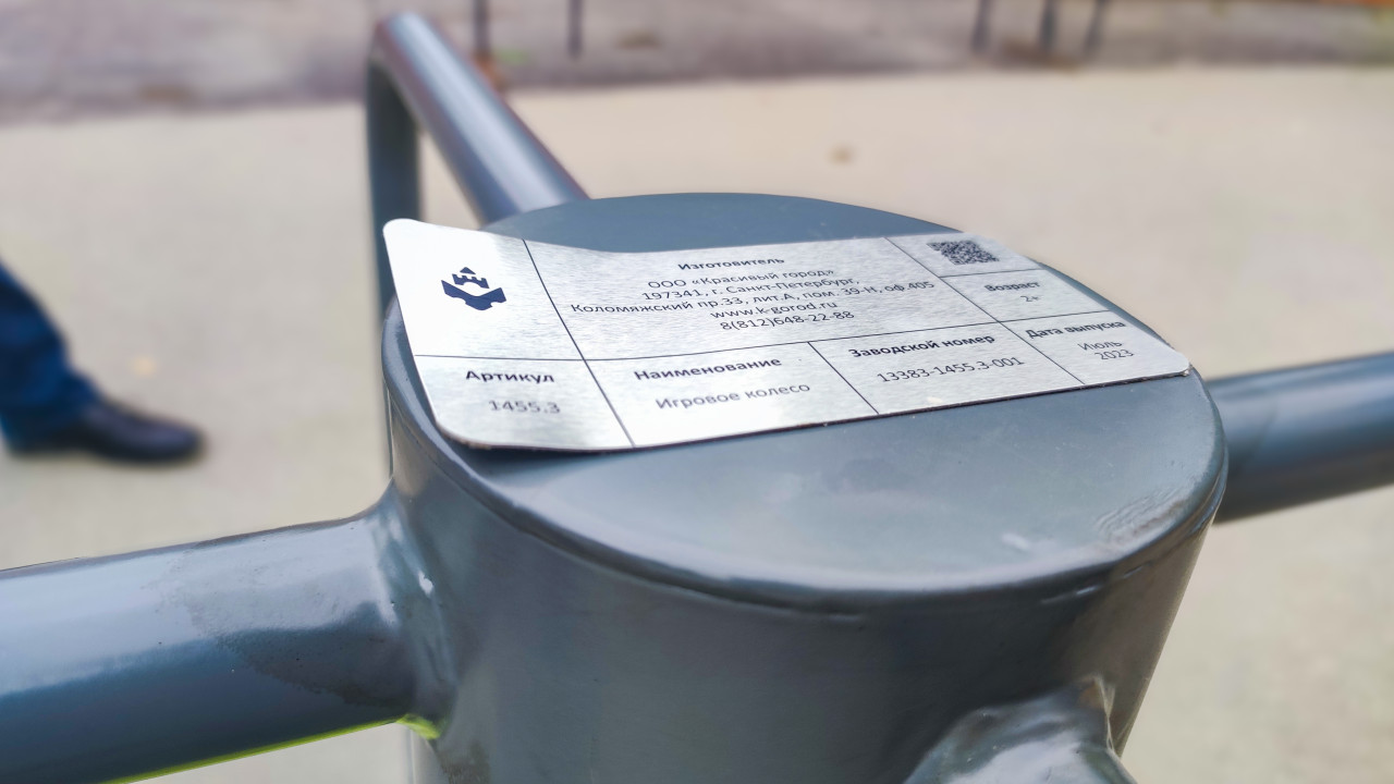 Крупным планом показана металлическая табличка с паспортными данными игрового оборудования, закреплённая на ручке конструкции. На табличке указано: «ООО Чёрный город, г. Санкт-Петербург, изделие — игровое колесо, артикул 1455.3, дата выпуска — июль 2023 года». Видно, что оборудование изготовлено в России, для использования детьми старше двух лет. Этот кадр фиксирует идентификационные данные, которые требуются при приёмке и эксплуатации детских площадок, а также в актах строительной экспертизы.
