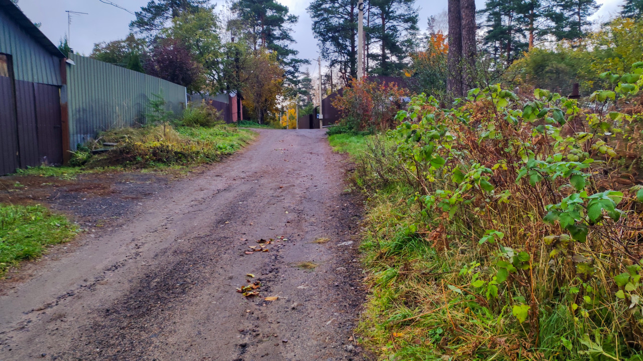 На фотографии изображена грунтовая дорога, проходящая между металлическими заборами частных участков. Слева тянется высокий забор из профнастила, справа видна зелёная растительность, включающая кустарники и траву. Вдали дорога плавно поднимается вверх, а на горизонте виднеются деревья и строения. Осенняя атмосфера передана мягким светом и влажной поверхностью дороги после дождя. Снимок можно использовать для материалов о загородной инфраструктуре, благоустройстве и сезонных изменениях природы.