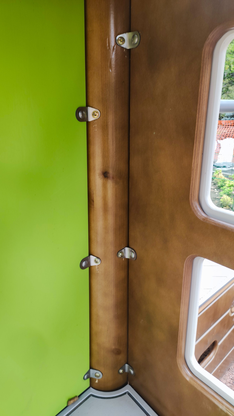 На фото показан участок внутренней части игрового домика, где соединяются панели коричневого и зелёного цветов. Видны металлические крепления, винты и элементы опоры. Снимок зафиксирован для отчётной документации строительного контроля с целью проверки качества подгонки деталей и безопасности узлов. Изображение можно использовать в экспертных отчётах и технических заключениях.
