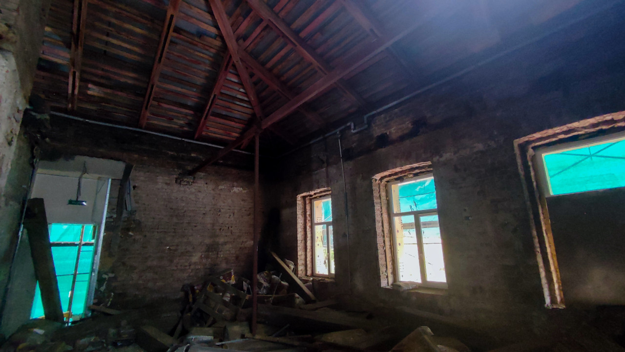 На фотографии показано помещение под кровлей исторического здания, где ведутся работы по реконструкции. Стены сложены из неоштукатуренного кирпича, потолок образован деревянными и металлическими фермами. Через окна с зелёной строительной плёнкой проникает рассеянный дневной свет. На полу виден строительный мусор и деревянные элементы перекрытий. Снимок иллюстрирует этап восстановления чердачного помещения при капитальном ремонте. Такие кадры применяются в материалах о реставрации, архитектурных обследованиях и реконструкции старинных зданий.