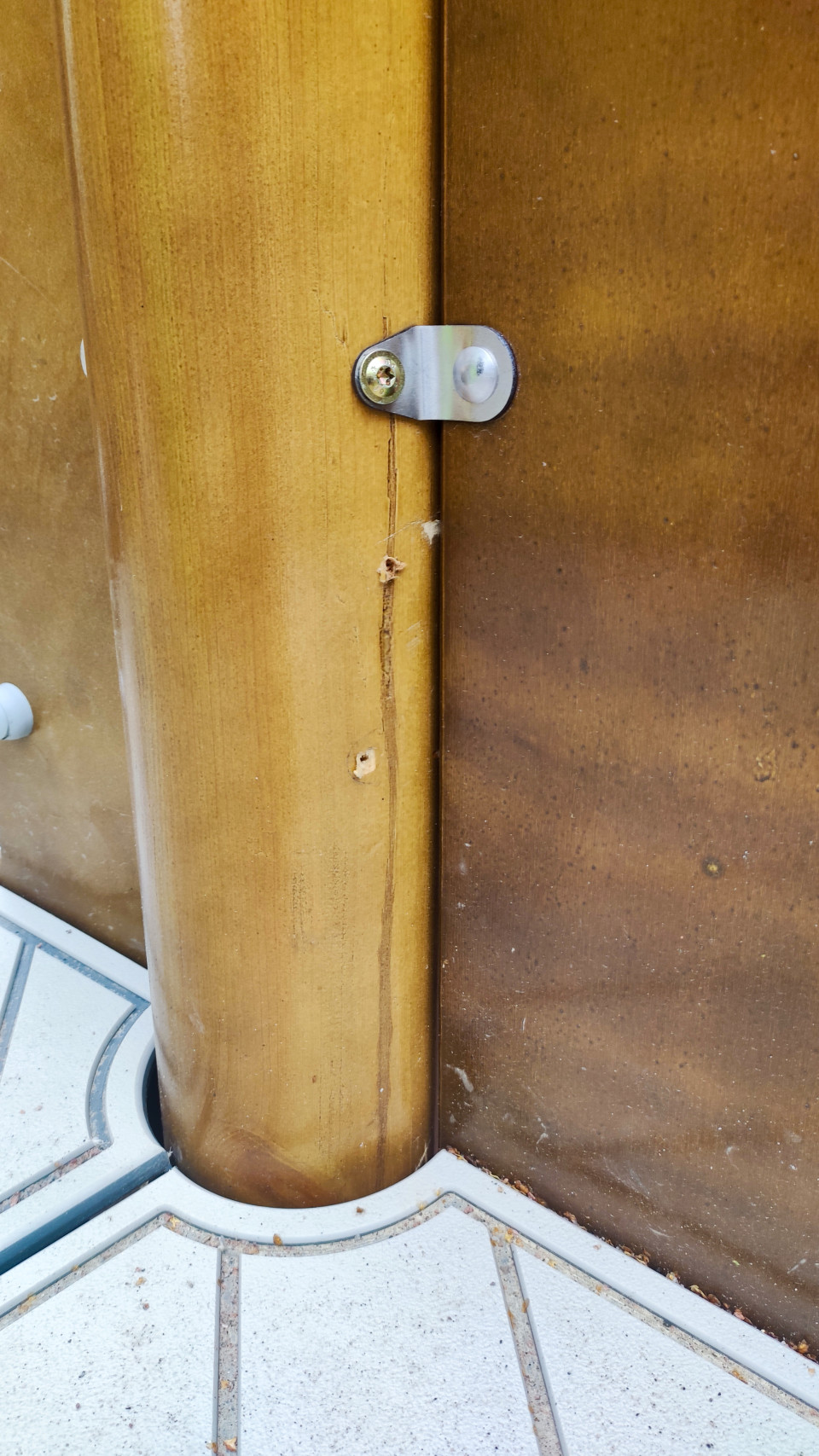 На фото изображён фрагмент деревянного столба конструкции детского игрового домика с механическими повреждениями — следами от сверления и трещинами вдоль волокон. Видна металлическая крепёжная пластина и часть пола с декоративными прорезями. Снимок выполнен в рамках строительной экспертизы для фиксации дефектов и оценки качества монтажа элементов детского оборудования.
