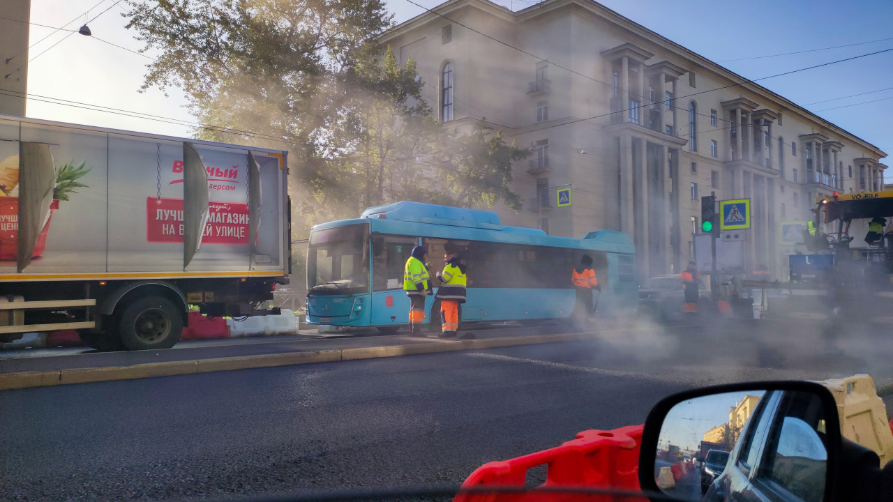 На фотографии зафиксирован момент дорожных работ в центре города: группа рабочих в сигнальной форме стоит рядом с голубым автобусом и асфальтоукладчиком. В воздухе виден пар от горячего асфальта. На заднем плане — здание советской архитектуры с колоннами и балконами, а слева в кадре — грузовик с рекламой продуктового магазина. Снимок демонстрирует реалии городской инфраструктуры и процессы обновления дорог в мегаполисах. Фото подходит для публикаций о городской логистике, транспорте и строительных технологиях.