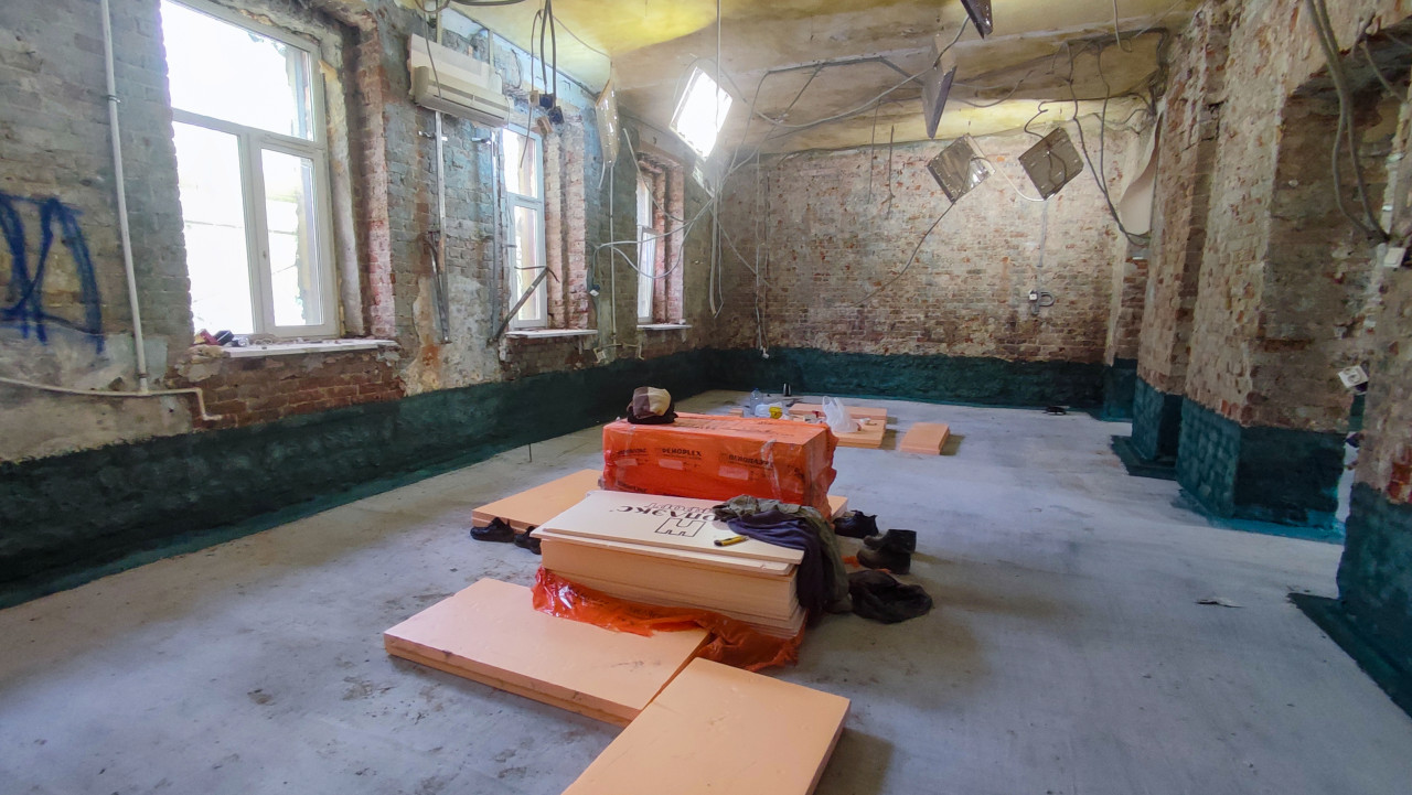 На фото показан этап утепления и подготовки пола в старом кирпичном здании. На полу разложены листы теплоизоляционного материала оранжевого цвета, часть из них уложена, остальные сложены в упаковке. Стены обработаны гидроизоляцией, на потолке закреплены временные светильники и электропроводка. Снимок иллюстрирует ход строительных работ при реконструкции исторического объекта и используется для документации и инженерного контроля.