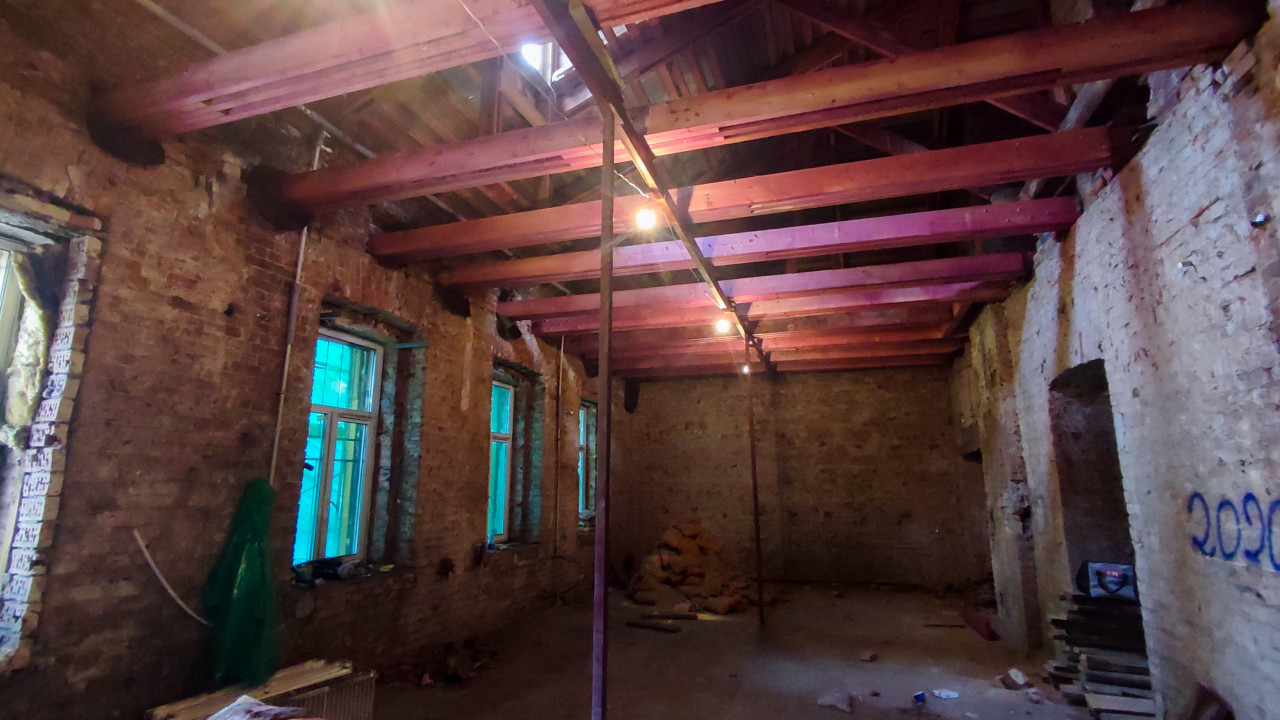 На фотографии запечатлено помещение старинного кирпичного здания, в котором проводятся работы по реконструкции. Потолок укреплён новыми деревянными балками, окрашенными в красный цвет, часть которых поддерживается металлическими стойками. Кирпичные стены без штукатурки и строительный мусор на полу указывают на стадию капитального ремонта. Окна с зелёной защитной плёнкой пропускают рассеянный свет. Снимок отражает процесс восстановления исторического объекта и усиления несущих конструкций. Изображение можно использовать в материалах о реставрации архитектурного наследия и строительных технологиях.