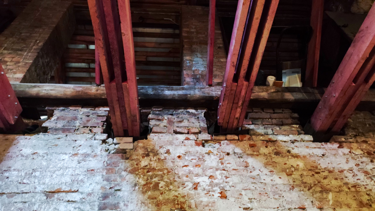 На фотографии изображены деревянные стропила, закреплённые на старой кирпичной стене. Видна конструкция кровли с частично разрушенной кладкой и старым балочным перекрытием. Состояние элементов указывает на процесс замены и усиления несущих узлов здания. Фото отражает рабочий этап реконструкции кровельной системы и восстановление архитектурных конструкций исторического объекта. Снимок можно использовать в материалах о строительстве, инженерных обследованиях и технологиях восстановления зданий XIX–XX веков.